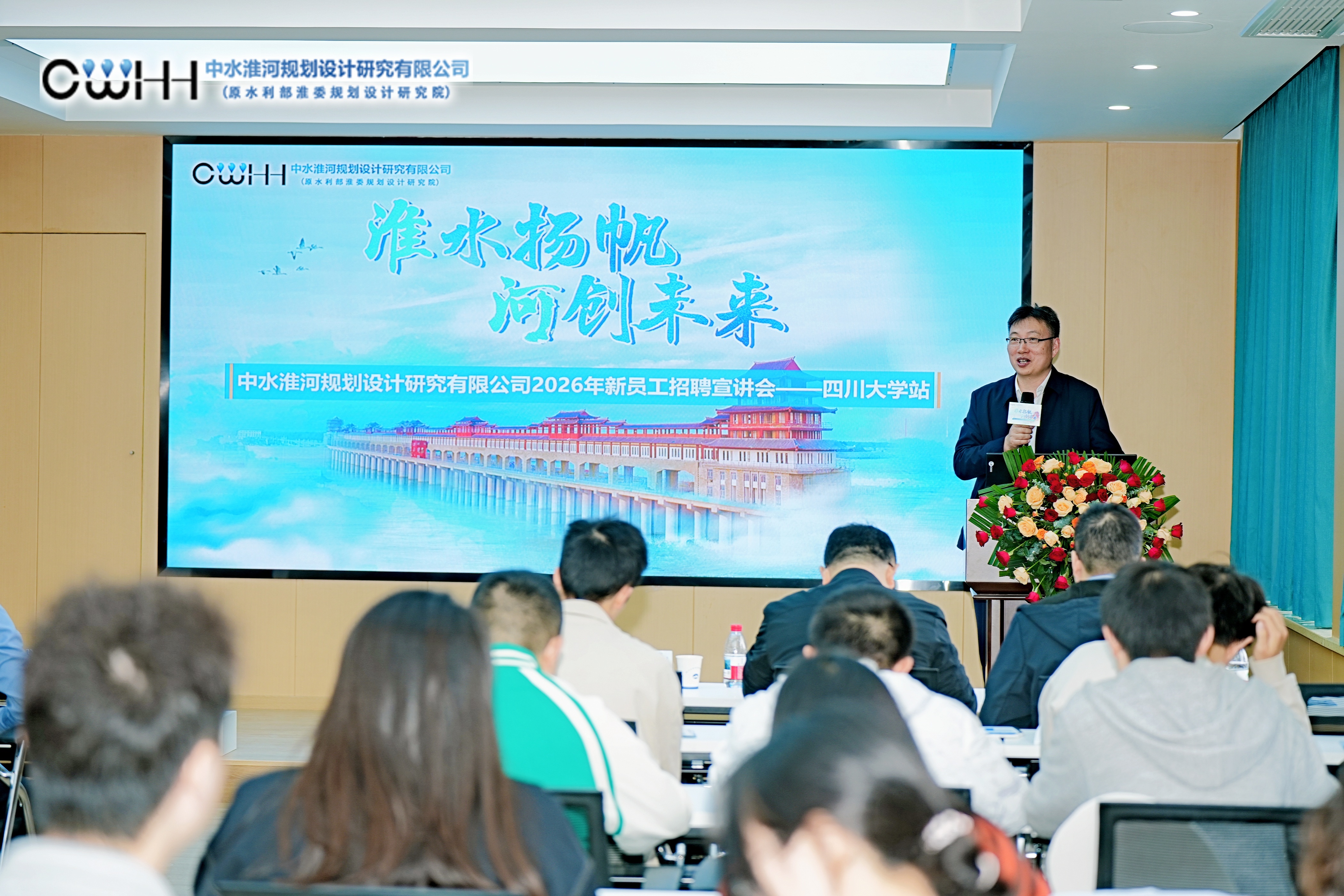 1989级水工专业校友、中水淮河规划设计研究有限公司党委书记、董事长孙勇,以《淮河入海水道工程淮安枢纽设计与施工关键技术》为题进行专题讲座。他向同学们系统阐释了现代水利工程的技术核心与管理智慧。他勉励同学们要筑牢专业根基,积极投身工程实践,在真实情境中培养解决复杂问题的综合能力。